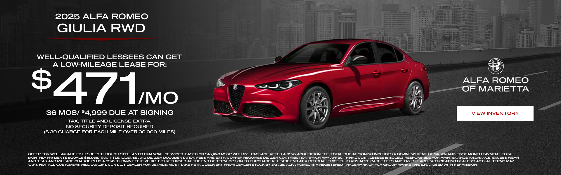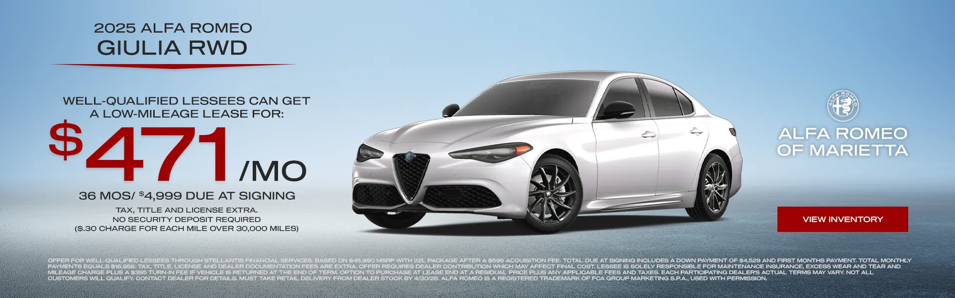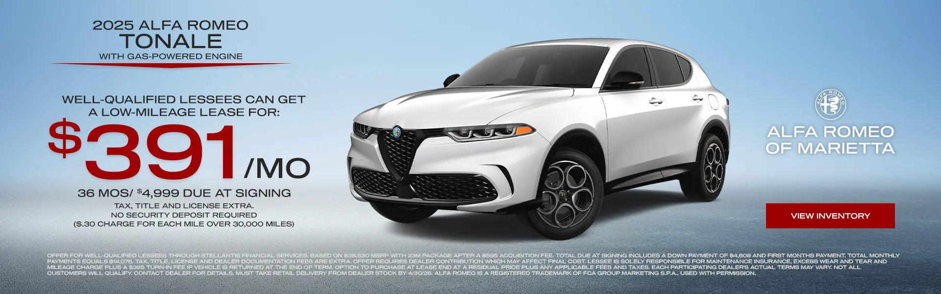 At Alfa Romeo of Marietta, we understand that purchasing a vehicle is a significant investment. Our Alfa Romeo Financing team is here to make the process as smooth and stress-free as possible. We offer a range of financing options tailored to your individual needs, whether you’re looking to buy or lease. Our finance experts work with multiple lenders to secure competitive rates and terms. Visit our Alfa Romeo car dealership in Marietta, GA, to speak with our financing team and get pre-approved today.